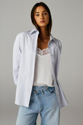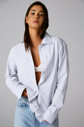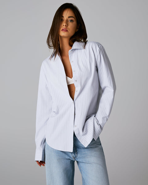 Opuštena, svetlo plava, prugasta i sa savršenim muškim krojem, i to u tvojoj veličini. Savršen spoj muškog šarma i ženskog stava.