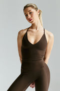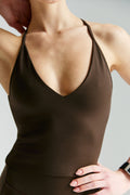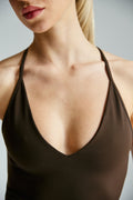 Dupli, elastični materijal nežno grli telo i prati njegove linije bez osećaja stezanja, dok ukršteni detalj na leđima daje suptilan, ali upečatljiv vizuelni momenat.